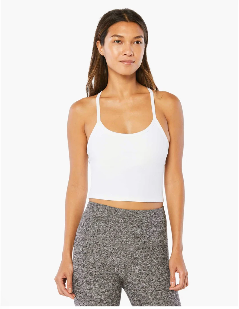 - Racerback design shows off shoulders