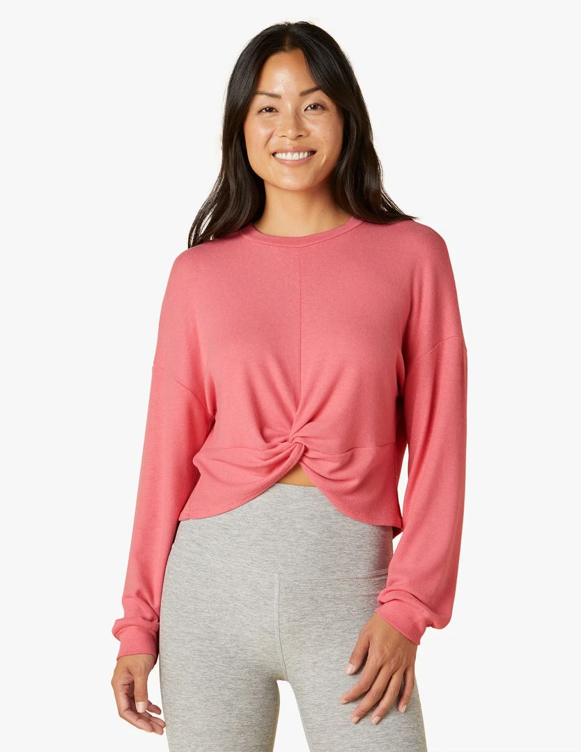 The softness and coziness of your favorite loungewear, with a high end fashion sense we can’t get enough of. Front twist feature on this crewneck pullover and it’s relaxed fit truly make this long sleeve top hard to take off. And why would you? Since this top makes it possible to take the most luxurious comfort everywhere you go.