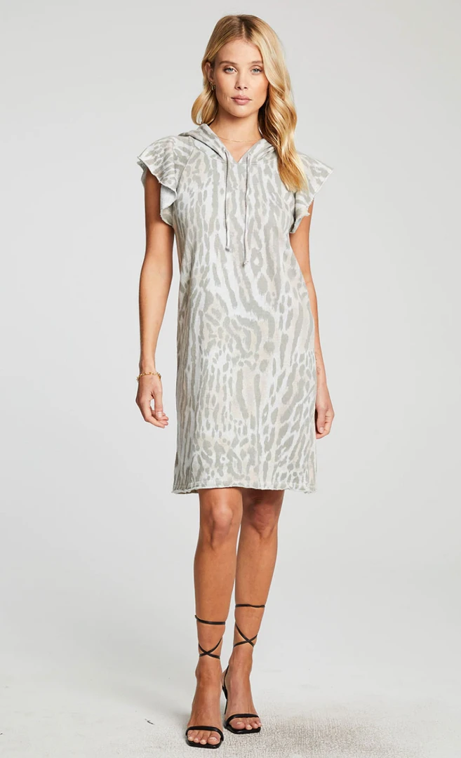 Our Linen French Terry Flutter Sleeve Hooded Sweatshirt Dress features imported fabric.