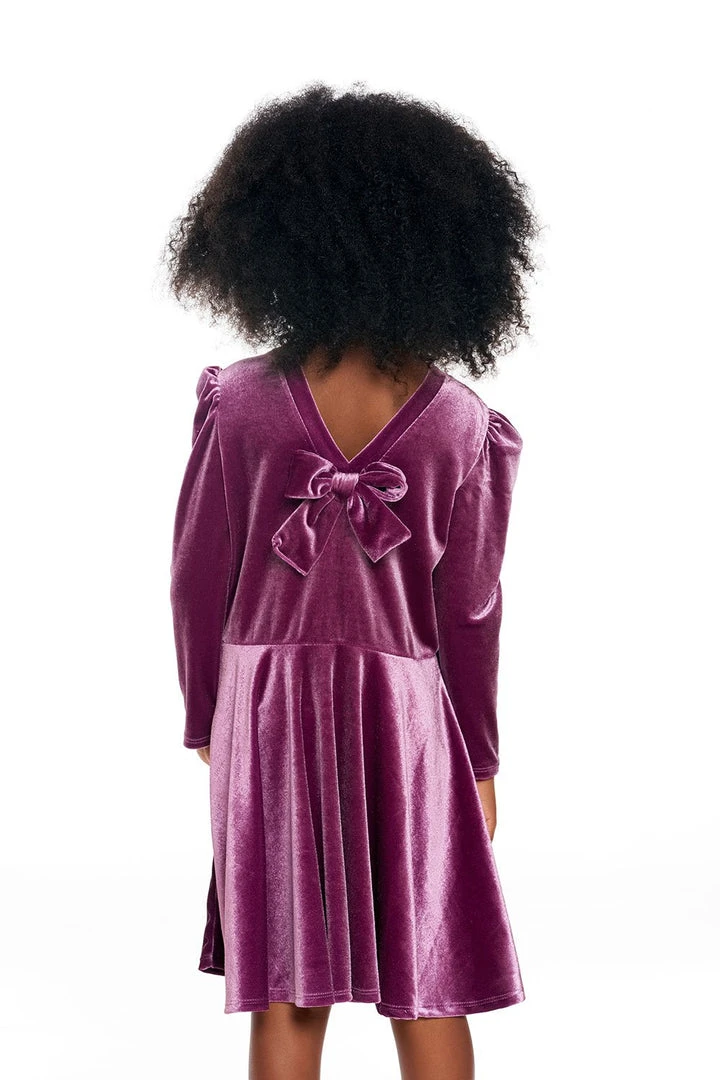 - Girls Stretch Velvet Bow Detail Puff Sleeve Dress