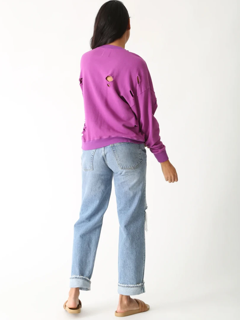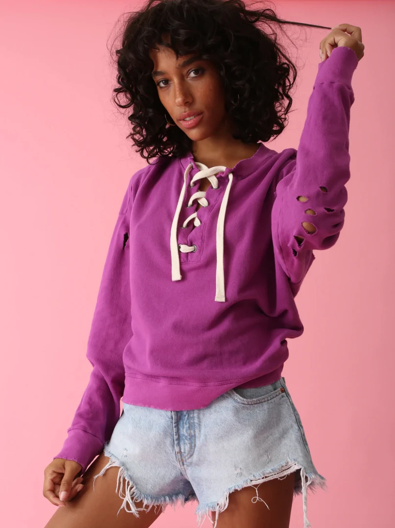 Introducing our latest front-lace tie sweatshirt, the Margot. Wear this piece for lounging in at home or going out around town to run errands. The Margot is perfect for when you are on the go, made from our signature 100% French Terry Cotton. It comes with detailed cord lacing, distressing and grinding at hems, grommets and a rib waistband and cuffs. Pair this with your favorite jeans to get the look!