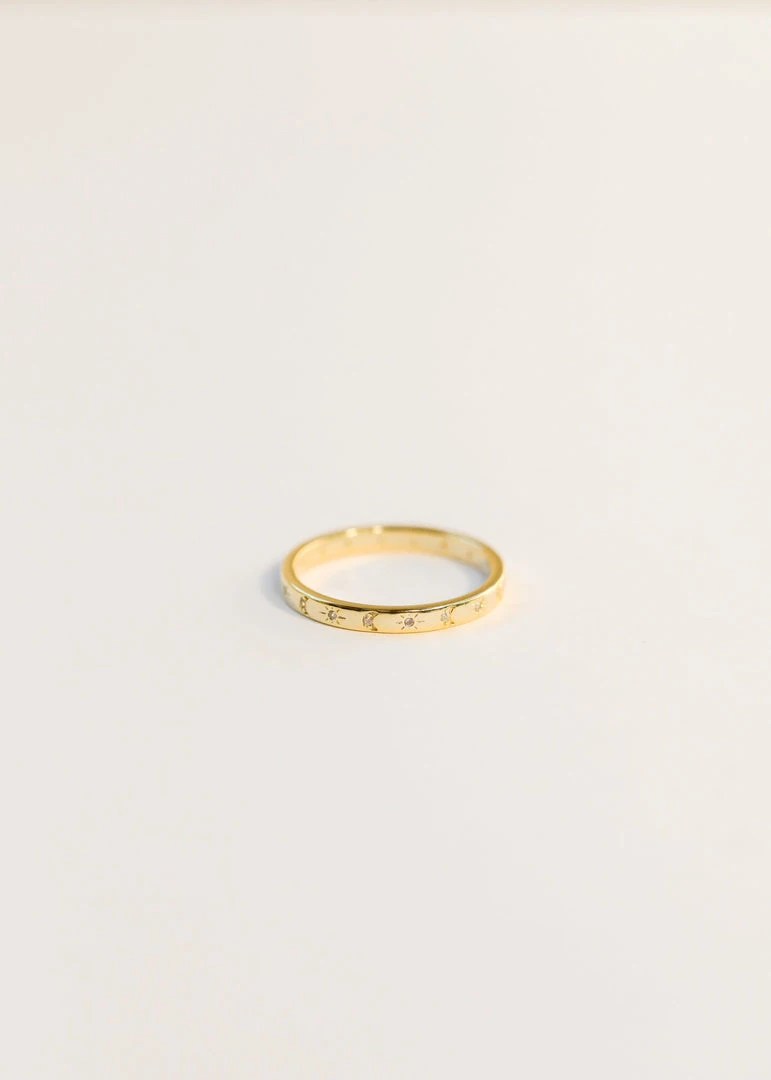 Tiny moons and stars encircle a band of gold, bringing their ethereal quality into your new favorite ring stack, and a gentle reminder to look up and embrace the universe. We crafted our collection of rings to make every day a reminder of joy, self-love, and to shine from within!