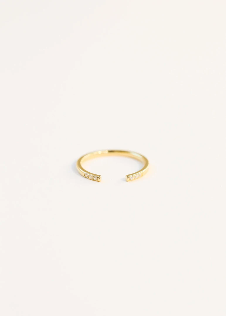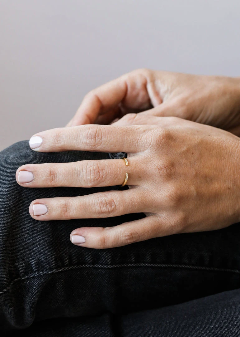 A delicate slice of crisp sparkling CZ’s wrapped around a classic thin band of gold made to stack to your heart’s content. The open setting is perfect for creating your own unique layered look, and a delicate squeeze will bring you the perfect fit. We crafted our collection of rings to make every day a reminder of joy, self-love, and to shine from within.