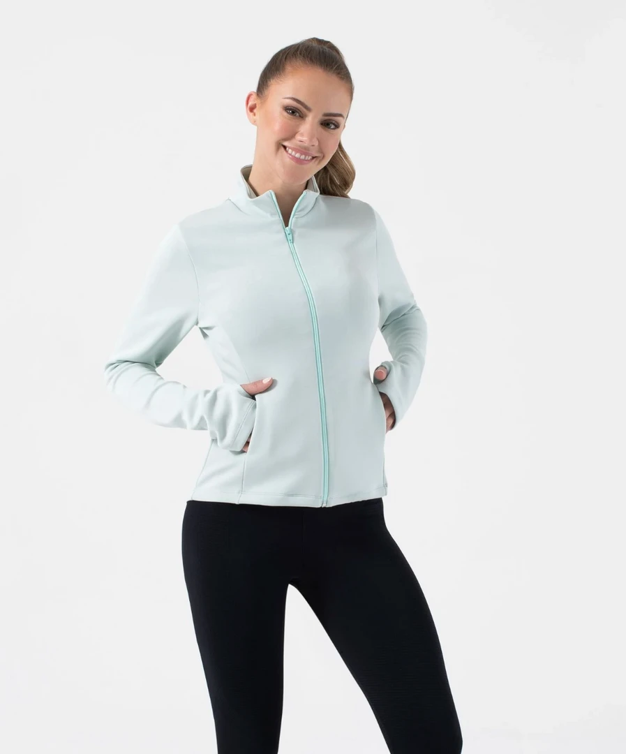 The jacket you will never want to take off! Thumbholes and front pocket keeps it functional while the soft fabrication keeps it cozy and comfortable. Perfect for layering under your favorite sports bra.