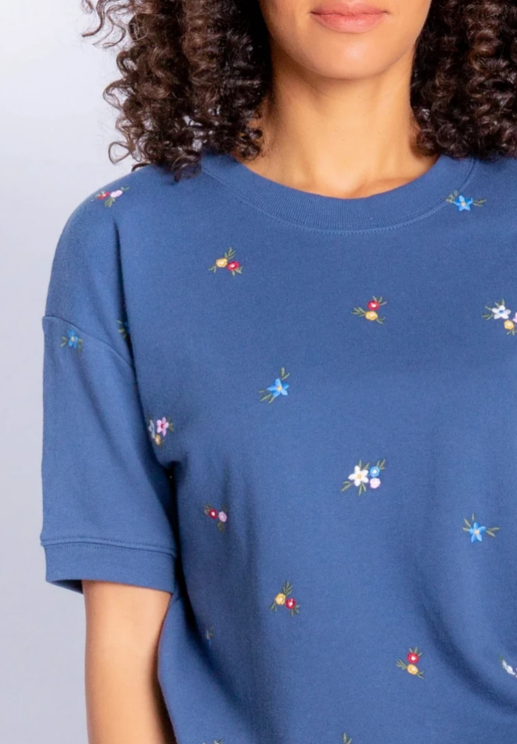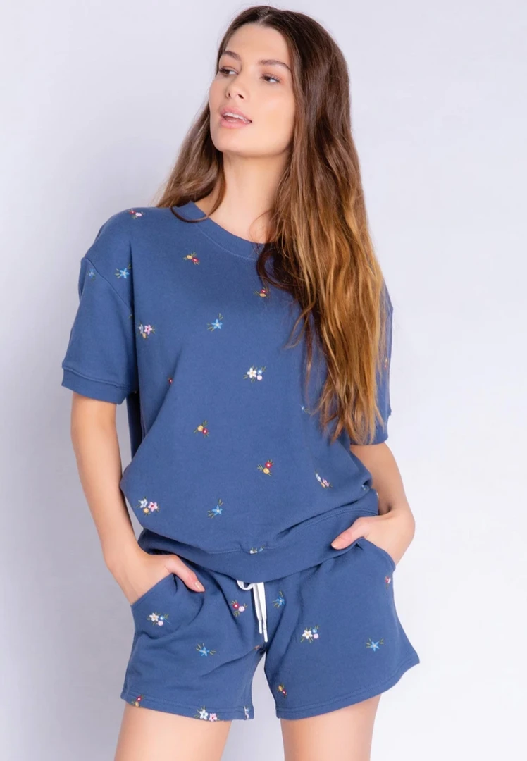 DESCRIPTION:Â A match set that feels fresh in navy cotton-blend terry – embroidered allover with mini flowers. Half-sleeve top & jogger pant with comfy pockets give it an upscale-casual vibe.