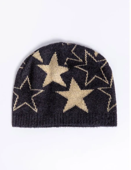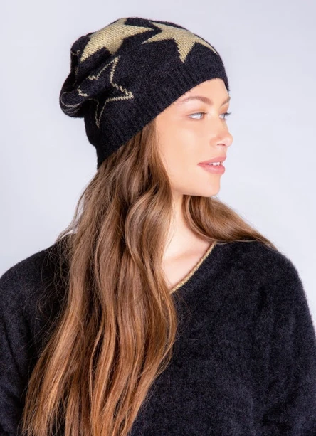 Description: Sparkly slouchy knit hat with metallic star detailing.