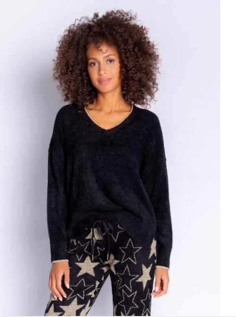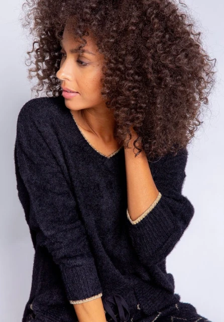 Description: When your outfit called for a cozy black sweater- this one has gold metallic tipping at cuffs and v-neck. Our relaxed fir sweater with open hem is the sweater you’ll reach for all season.