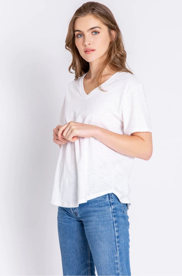 DESCRIPTION:Â Flattering, versatile & everyday wearable. Our white V-neck t-shirt, in cotton-blend slub jersey has a relaxed, longer length, with rounded hem.