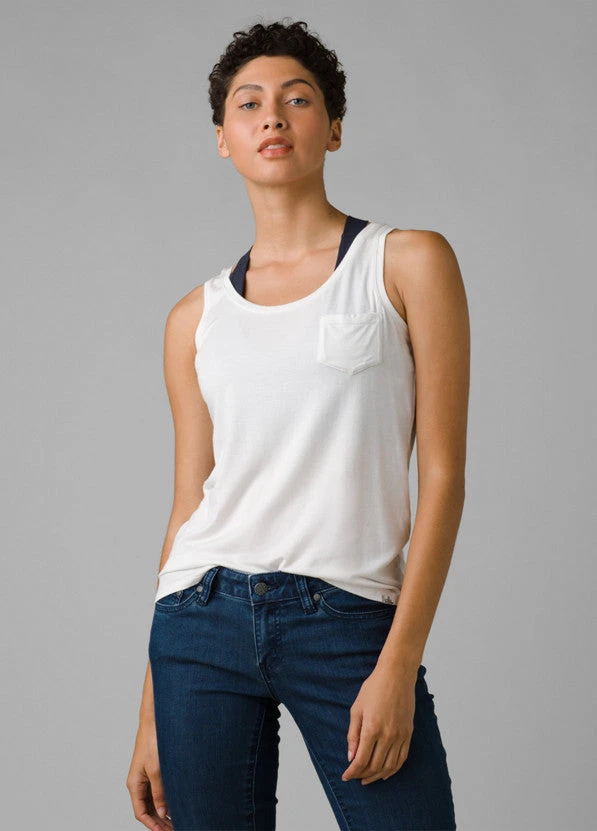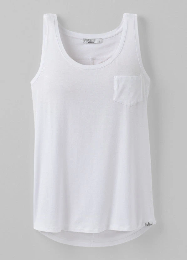 - Sleeveless scoop neck pocket tank silhouette with back seam details