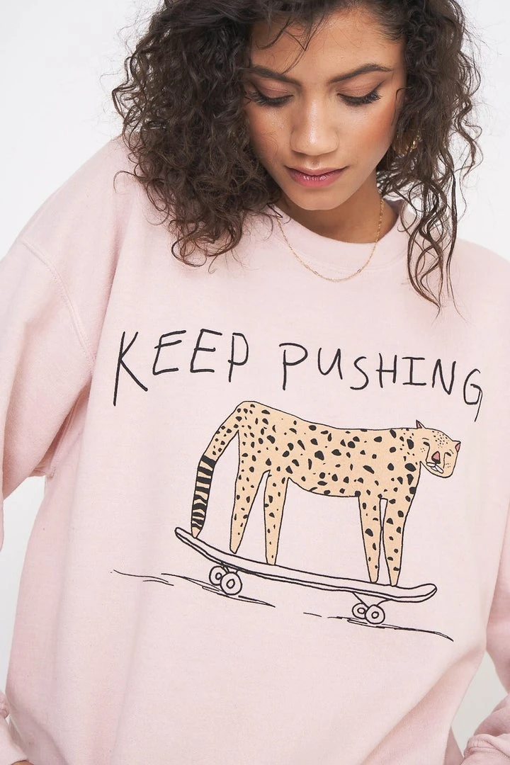 This lightweight crewneck sweatshirt is the perfect motivation you need to start off your day. Keep Pushing features a leopard on a skateboard graphic print, banded cuffs and hemline. Size up for that extra cozy fit.