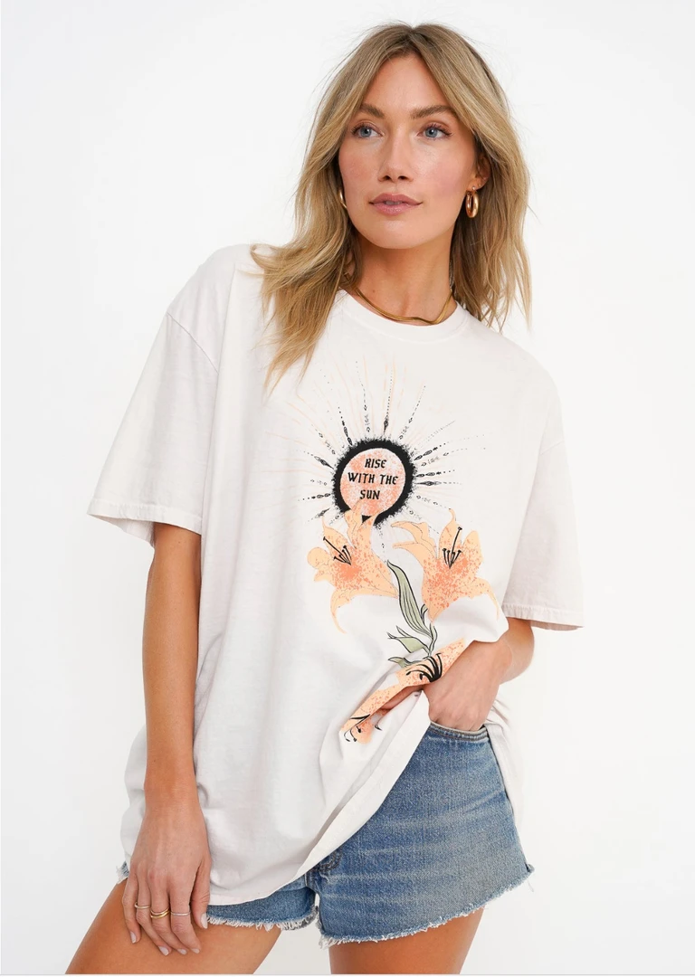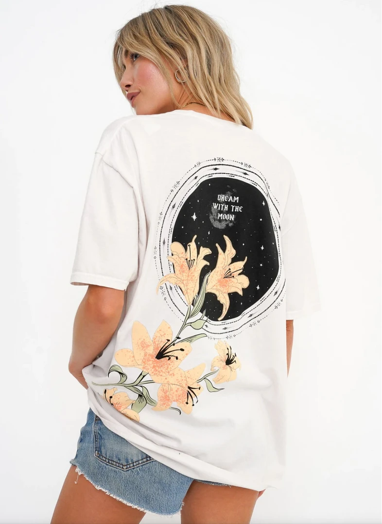 The Rise With The Sun Oversized Tee has a relaxed fit with gentle drop sleeves and extra added comfort courtsey of our signature 100% cotton fabric. The ‘rise with the sun’ and ‘dream with the moon’ sayings perfectly complement those blissful Summer days that we all lust after. Bright pastels and detailed graphics stand out on our Vintage White color, adding a playful pop to your OOTD.