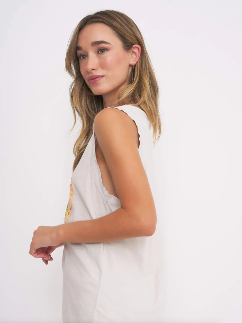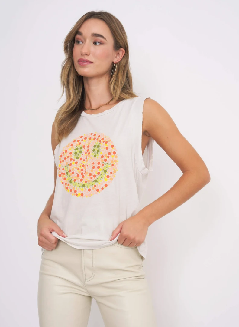 This Smiley Trip Tank will have you smiling from ear to ear. It features a crewneckline, banded armholes and distressing details along the edges. Don’t trip, you are seeing a smile through the dotted colored graphic print.