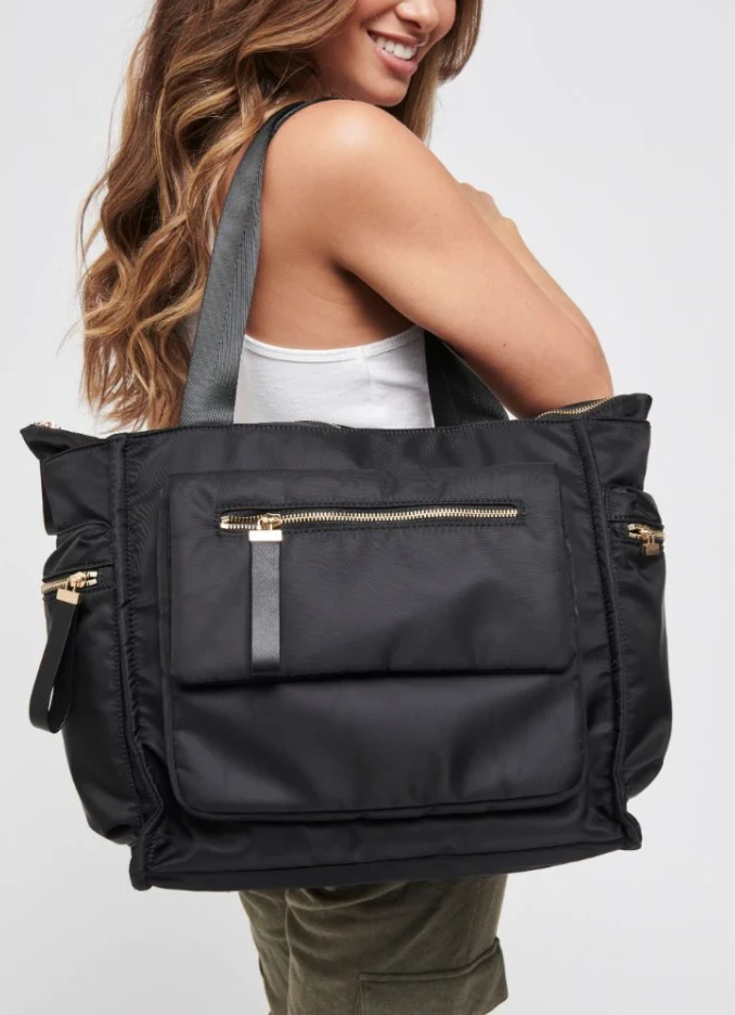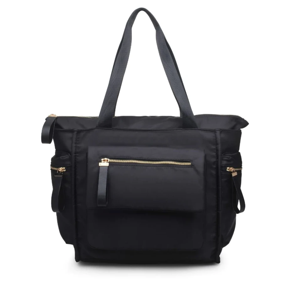 - Exterior Details: Large front snap pocket. Zipper pocket on front flap. Zip closure pocket on the back. 2 side pockets with zip closure.