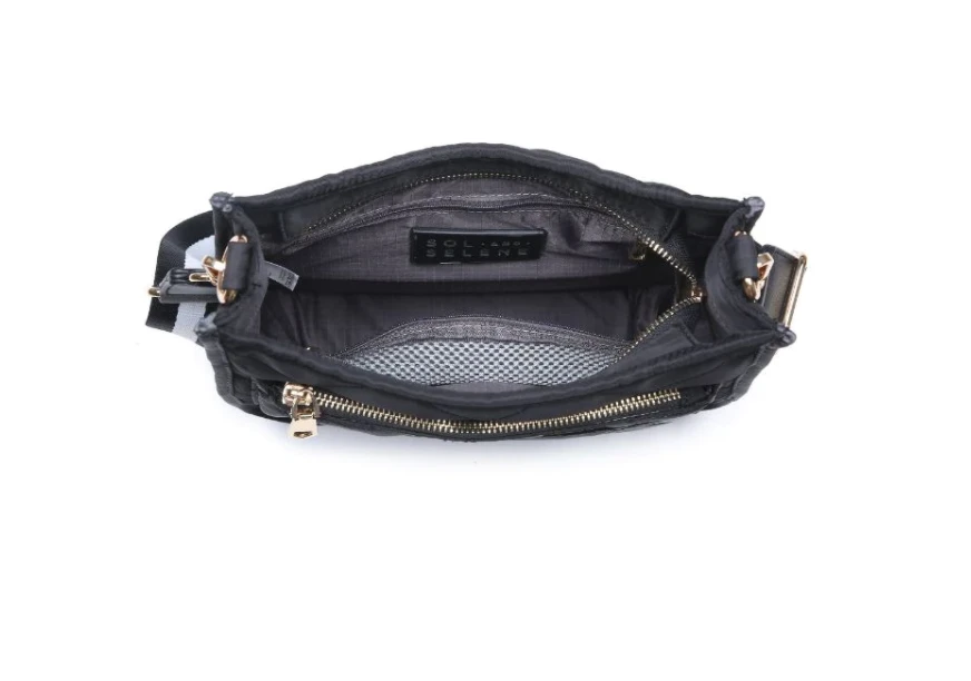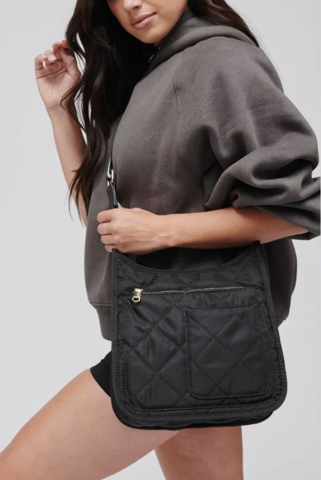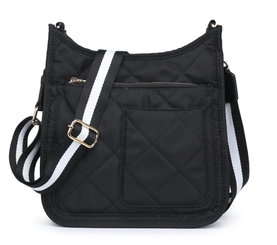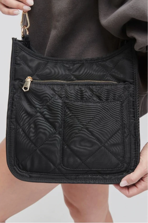 - Exterior Details: Quilted, front zip compartment, front slip phone pocket, back zip pocket
