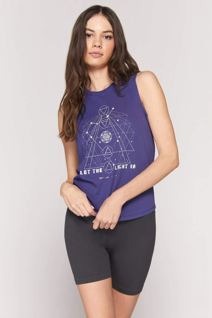 See the light, be the light, know the light. Let the light in while flowing in our best selling Muscle Tank. Designed for incredible breathability for all your sweat sessions, our Light Muscle Tank features a slim fit, slightly dropped armholes, a sacred geometry inspired front graphic with the mantra “Let the light in”, and hits at hip length.Â