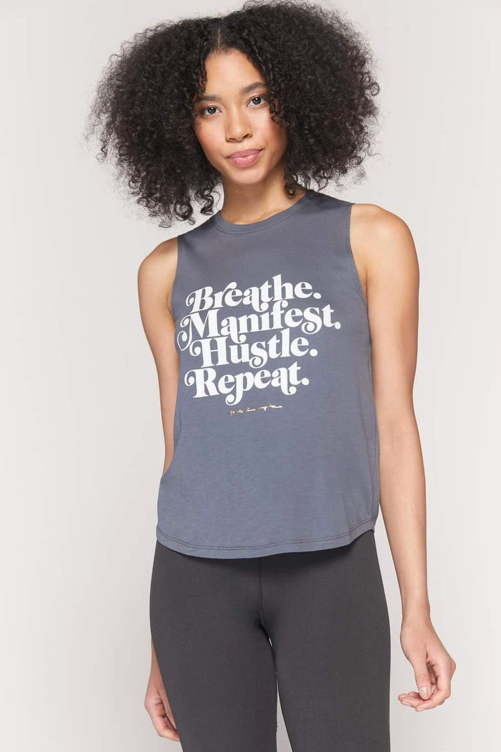 Make gratitude a daily habit in our best selling Muscle Tank. Designed for incredible breathability for all your sweat sessions, our Repeat Muscle Tank features a slim fit, slightly dropped armholes, a vintage inspired front graphic reading “Breathe, Manifest, Hustle, Repeat”, and hits at hip length.