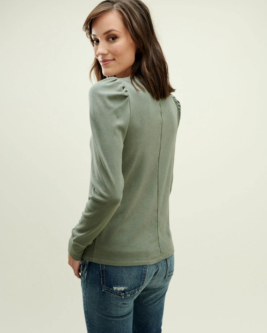 We made a charming tee topped with a puff shoulder. Crafted from our Classic Layering Knit fabric, it’s finely ribbed and ultra soft. It stretches to shape to your body but bounces back to its original form. An ideal essential to wear alone or as a layering piece.