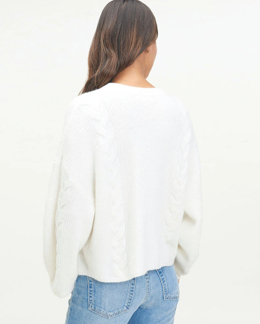 Our Natalia Sweater is crafted from Lodge yarn — a lightweight and fuzzy wool blend that’s not heavy or itchy making it a transitional, seasonless piece. Crafted with beautiful cable pattern, it’s the perfect ‘throw-it-on-with-jeans’ sweater.